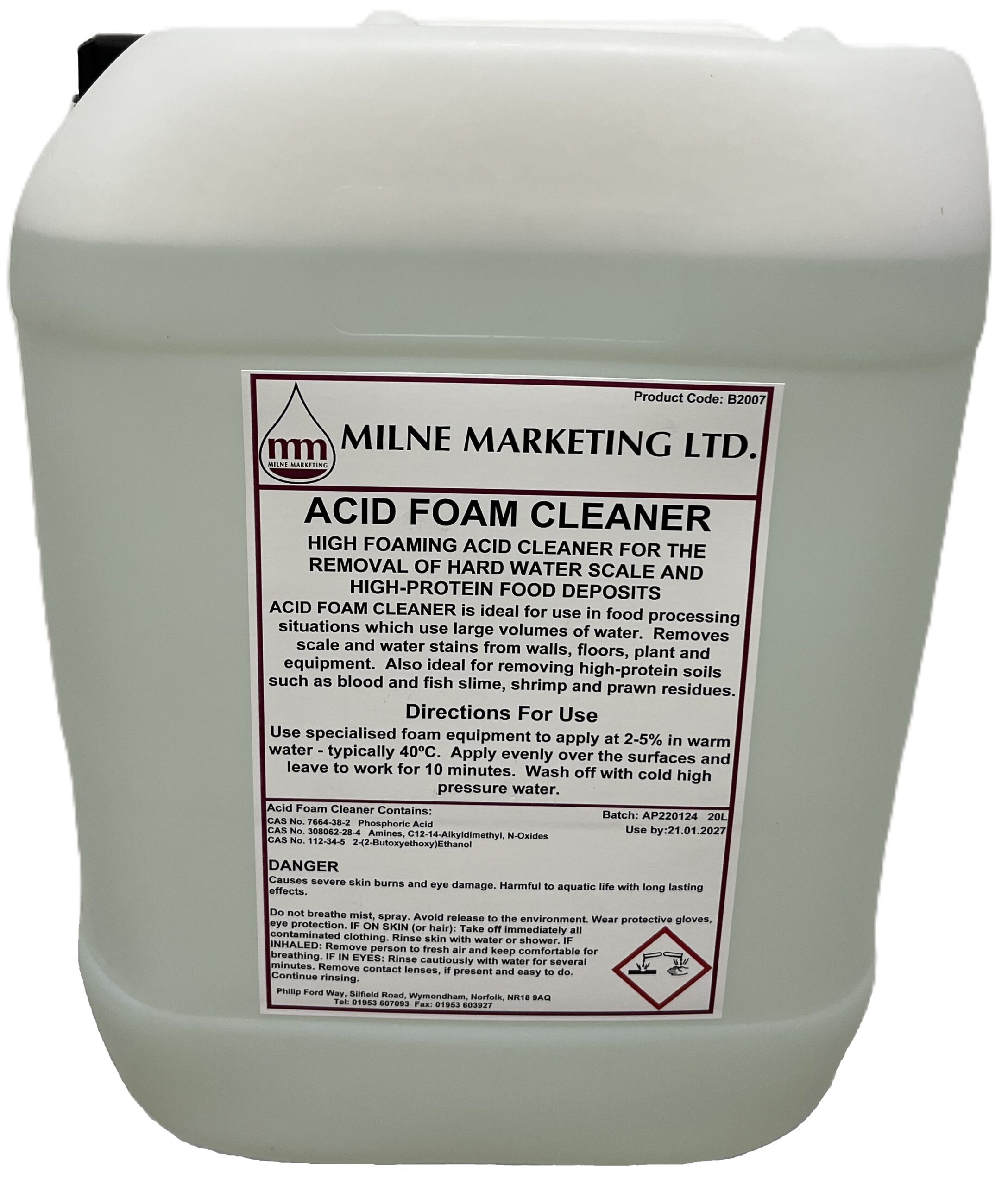 • Acid foam cleaner is ideal for removal of hard water scale and high protein food deposits in food processing situations that use large volumes of water. Removes scale and water stains from walls, floors, plant and equipment. Also ideal for removing high protein soils such as blood and fish slime, shrimp and prawn residues.