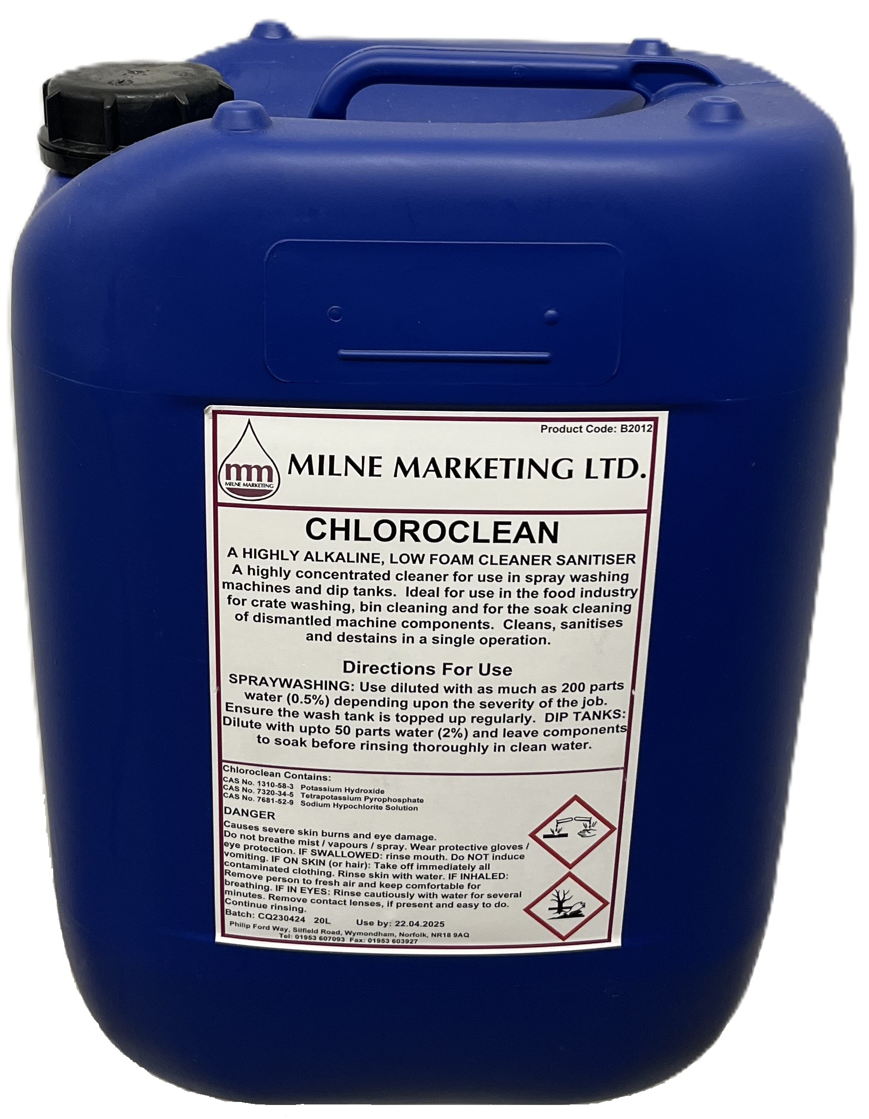Chloroclean is highly alkaline, low foam cleaner santiser, highly concentrated cleaner used in spray washing machines, dip tanks. Used into food industry for washing crates, bins and machinery.